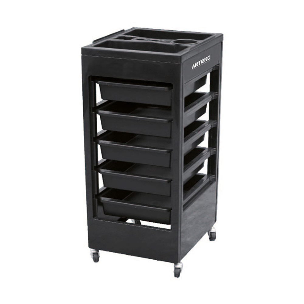 Estación de trabajo portátil para ir dejando las herramientas y utensilios que más se utilizan, como máquinas, tijeras, secadores, pinzas, peines, etc., de una forma ordenada y siempre a mano.
