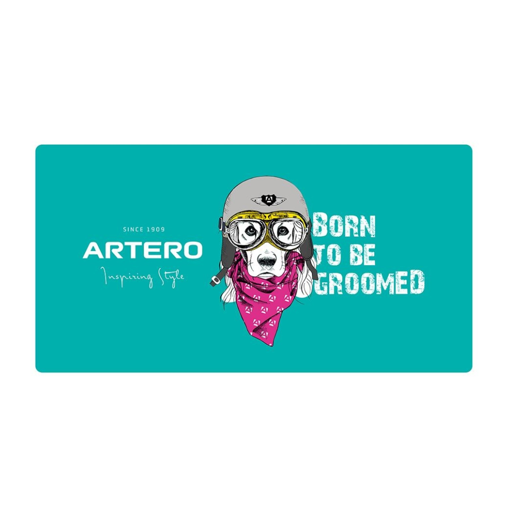Esterilla de caucho Premium con superficie antideslizante para que no resbalen las mascotas, acolchada para evitar el cansancio y fácil de limpiar. Diseño de logo Artero Born To Be Groomed en color turquesa. Ideal para mesas de peluquería o superficies donde vayamos a manipular un perro.