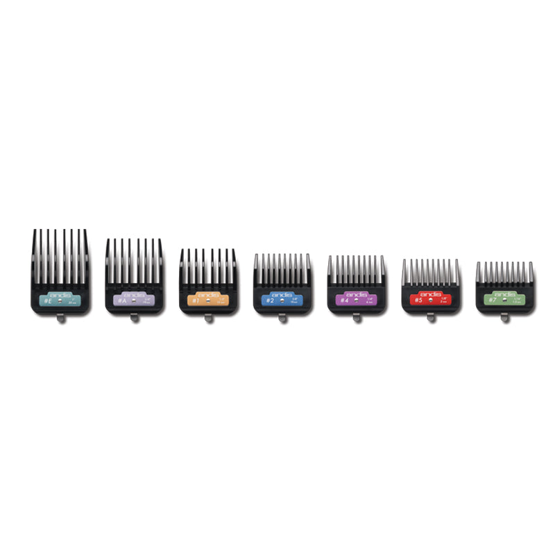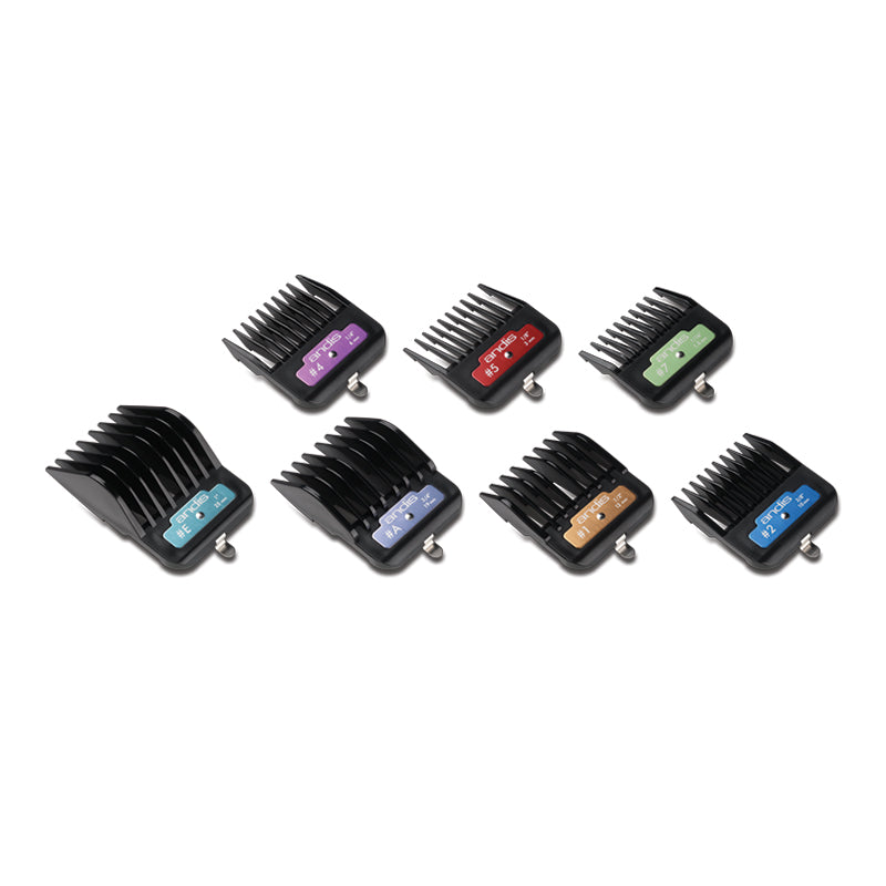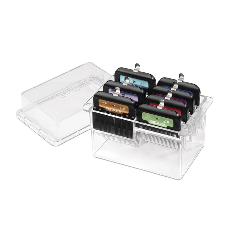 Codigo de colores para una rapida identificacion +El clip de metal se fija de forma segura al peine +Utilizar con peines #10 o #30 +Los tamaños de los alzadores son +Los tamaños de los Alzadores son: 1.5 mm (#7), 3 mm (#5), 6 mm (#4), 10mm (#2), 13 mm (#1), 19mm (#A) y 25mm (#E)