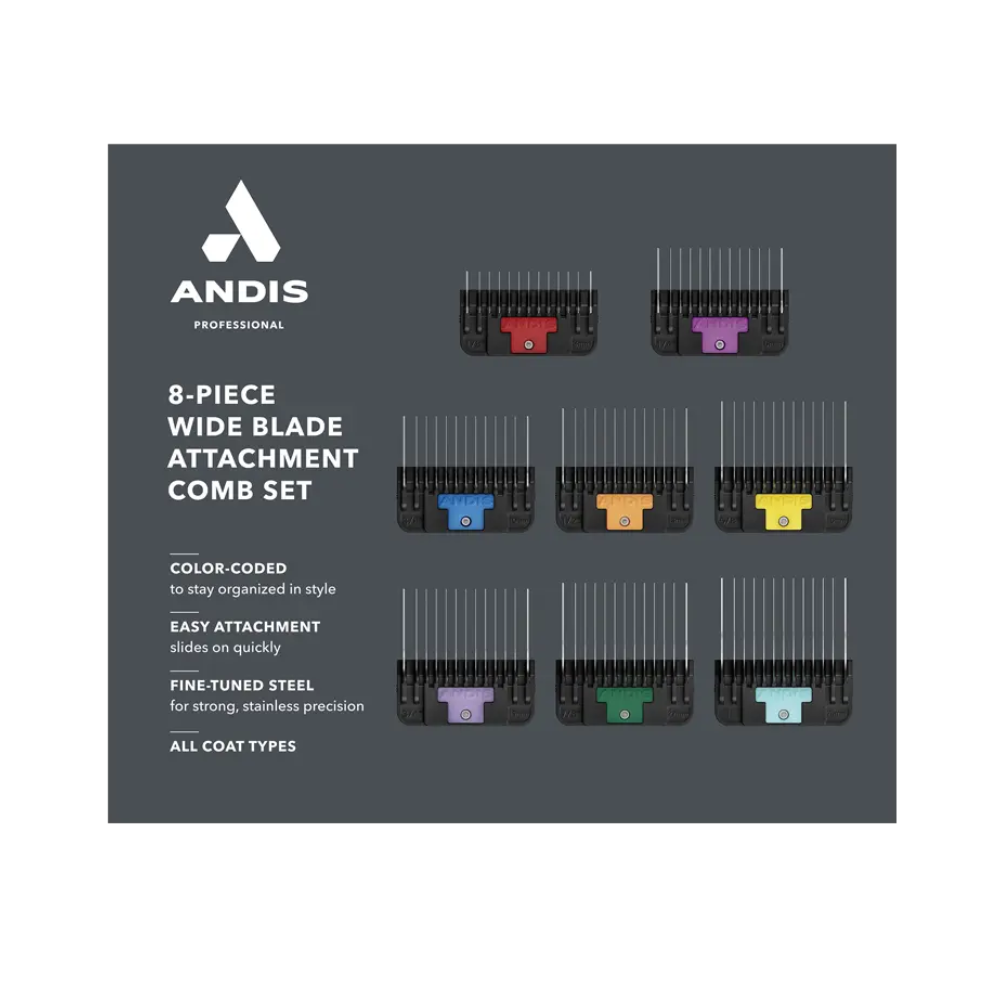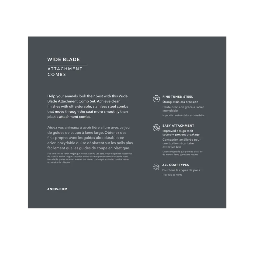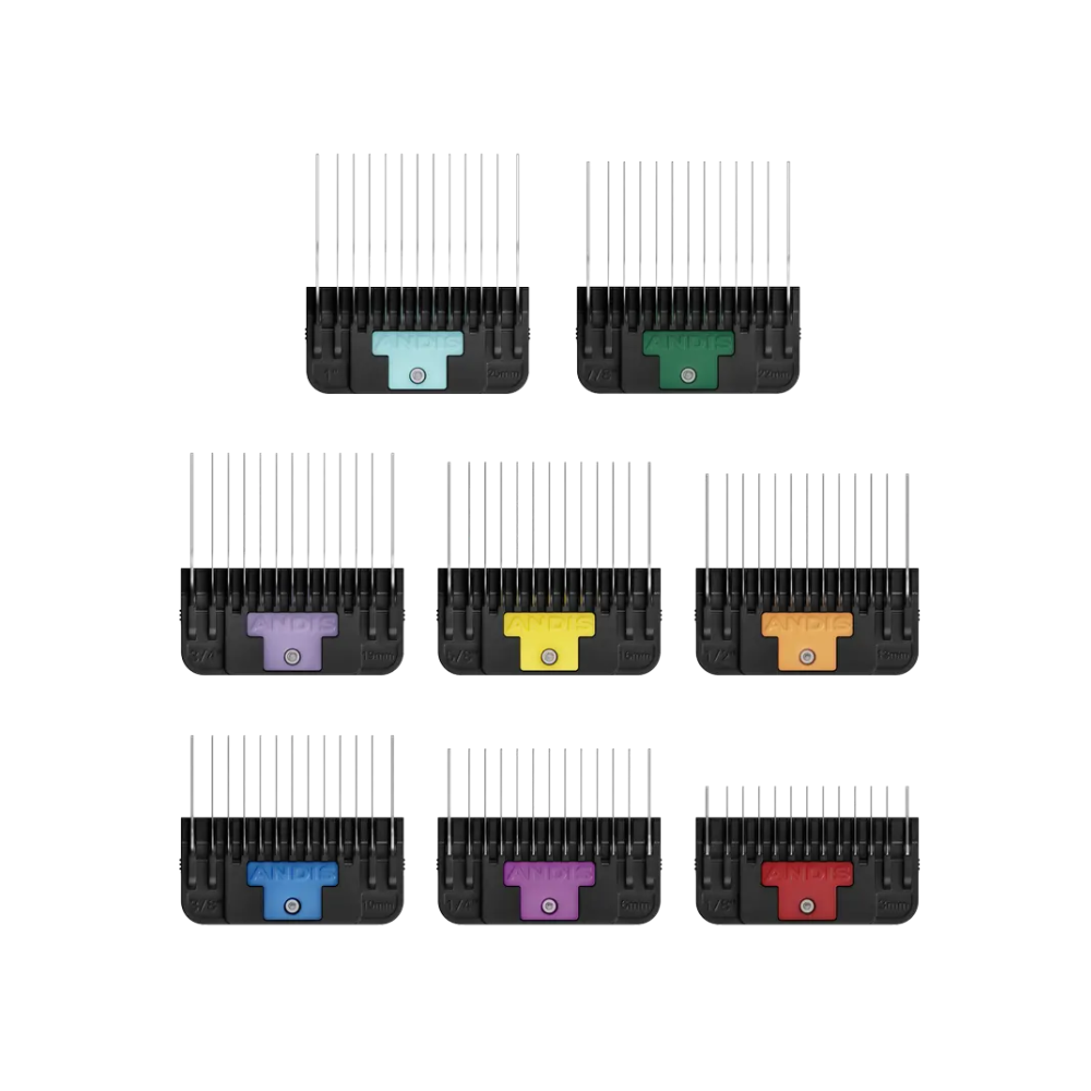 Mejora todas tus opciones creativas con este juego de alzadores anchos codificados por color. Ideal para razas grandes, estos peines de acero inoxidable de alta calidad se acoplan fácilmente a tus necesidades.