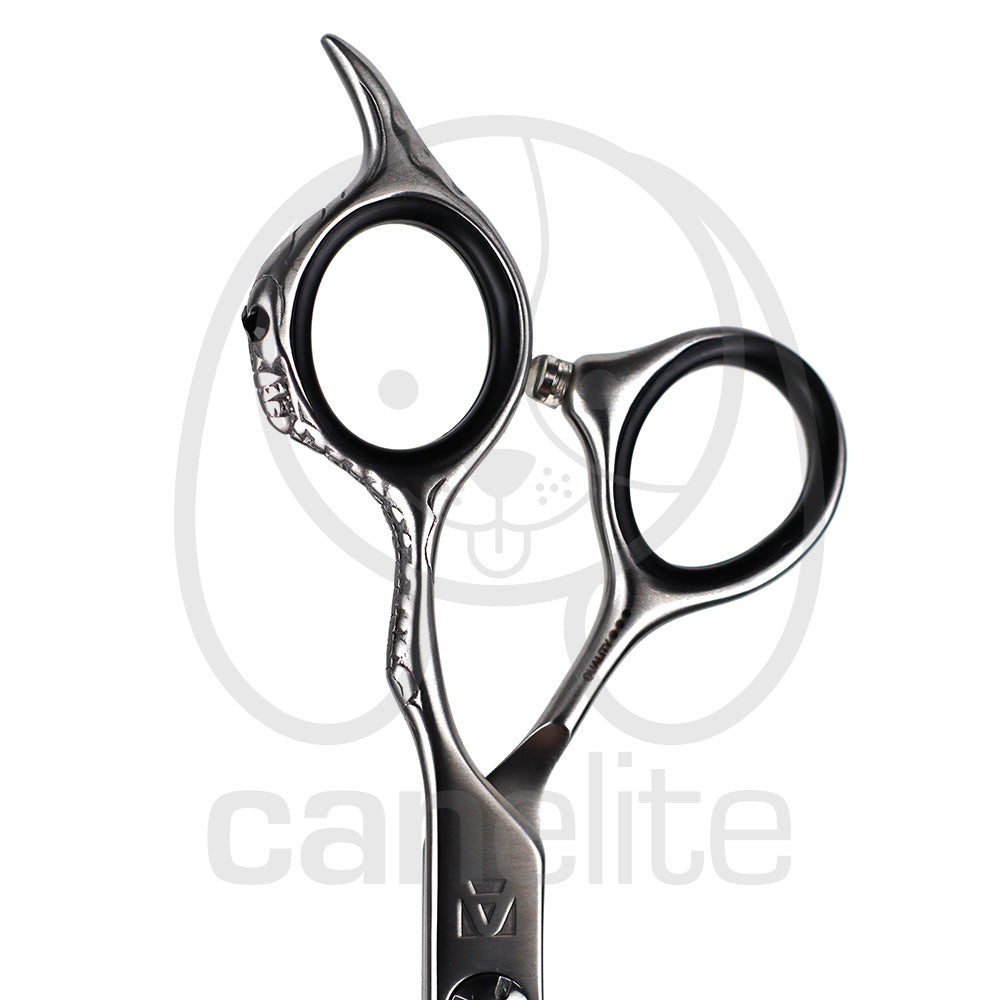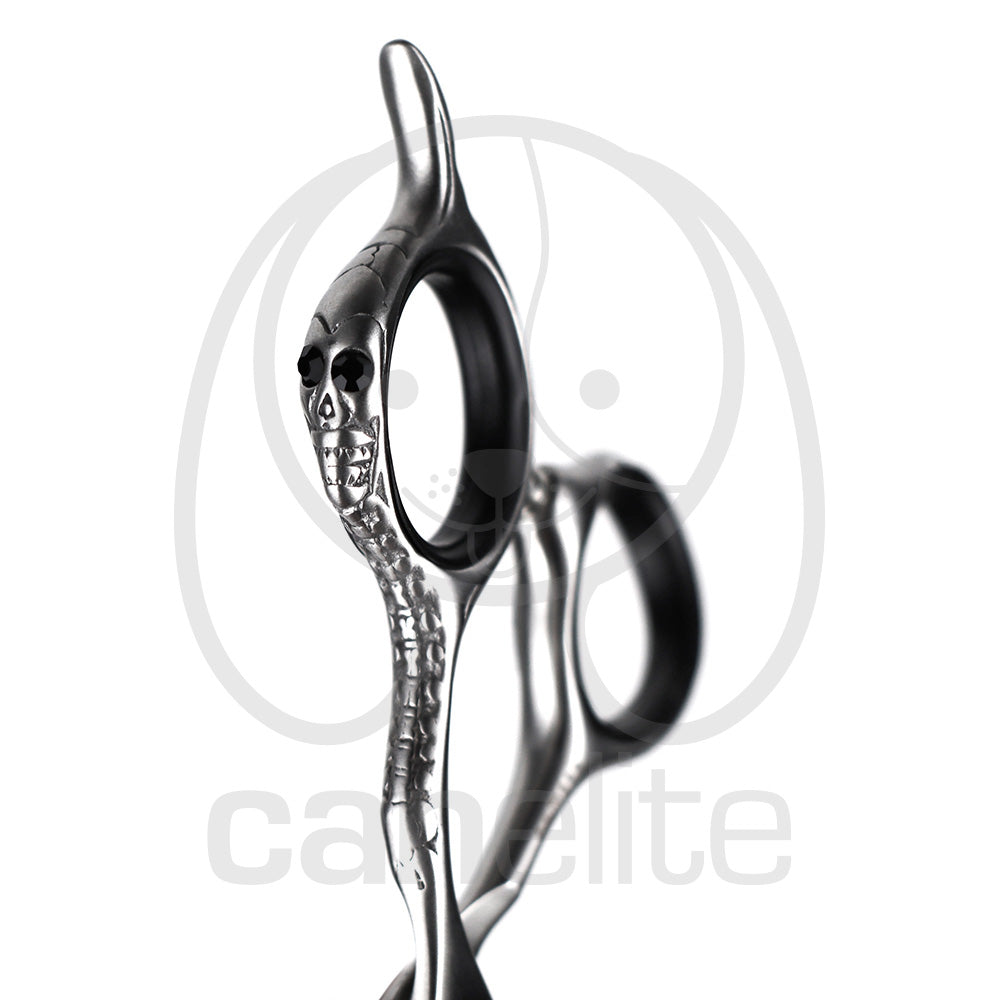 Tijeras de peluquería de alta calidad de acero mate y detalle de una calavera en el dedal.