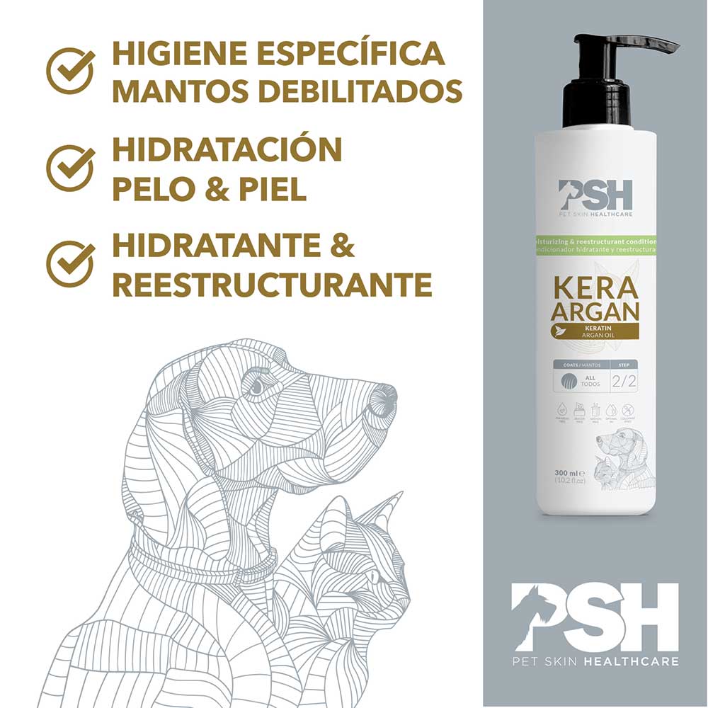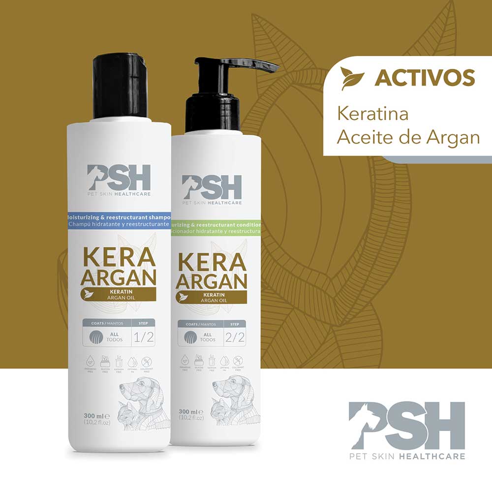 El acondicionador Kera Argan está indicado para la higiene y nutrición extra de mantos secos. Esta fórmula combina la acción sinérgica y los beneficios del aceite de argán y la queratina, que nutren en profundidad el manto y aportan fuerza al bulbo piloso.
