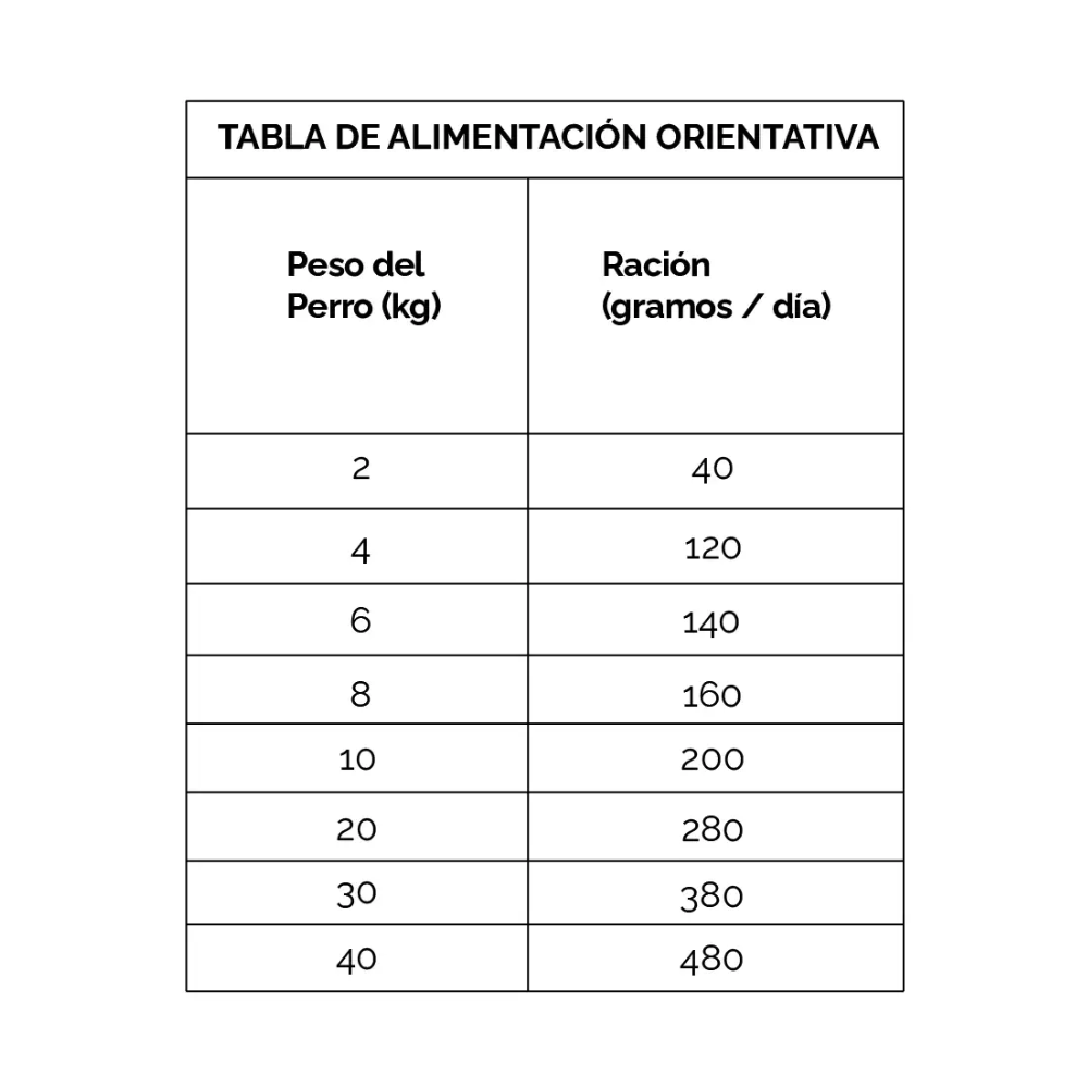 Coloque la cantidad de alimento sobre el comedero (ver tabla orientativa) Tenga en cuenta que las cantidades indicadas en la tabla orientativa variarán en función del peso, actividad física, etc., existiendo también un componente de variación relacionado con la individualidad de cada animal. Si realiza algún cambio de alimentación que sea paulatino, a lo largo de 4 o 5 días, para evitar la aparición de desórdenes intestinales. Es muy importante que el animal disponga siempre de agua limpia y fresca en abundancia. Mantener el envase bien cerrado en un lugar fresco y seco, aislado del suelo y procurando que esté alejado de los rayos del sol.