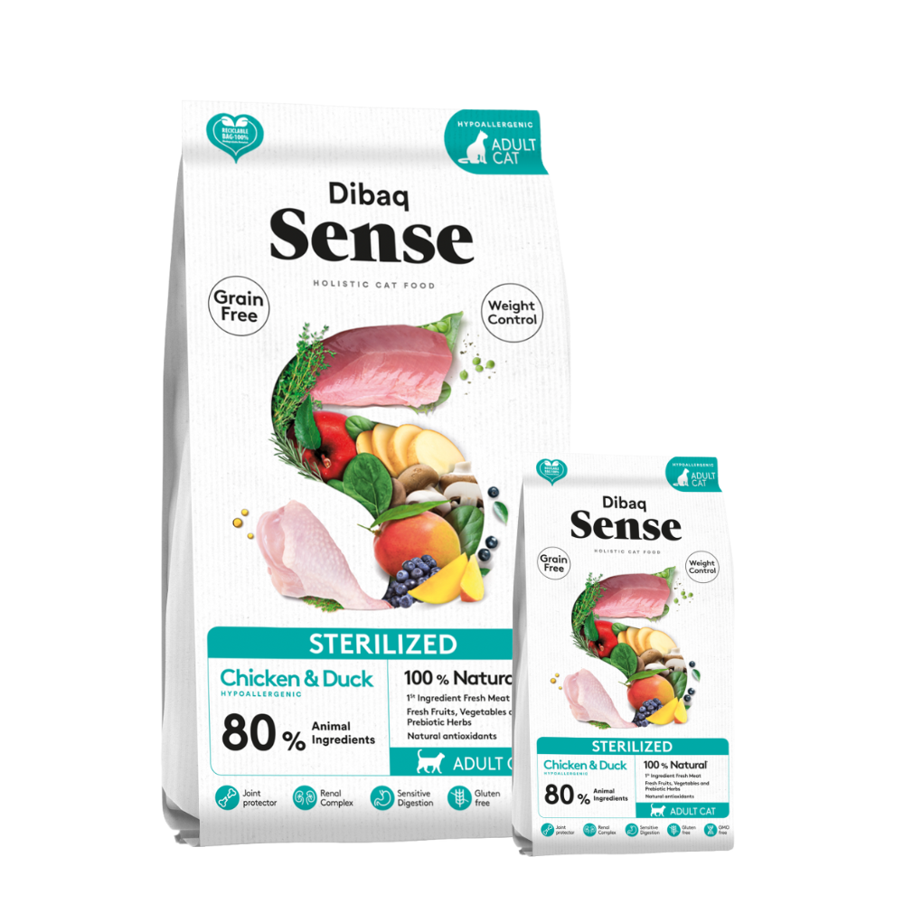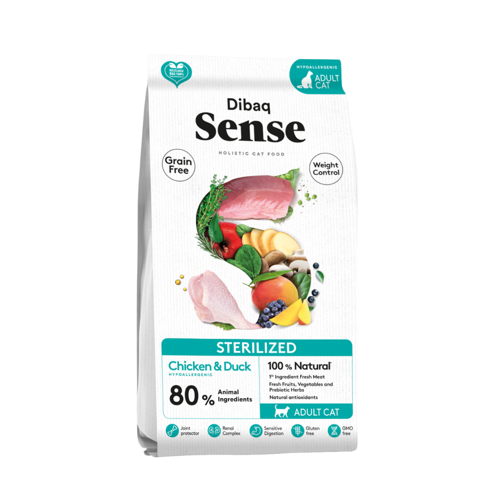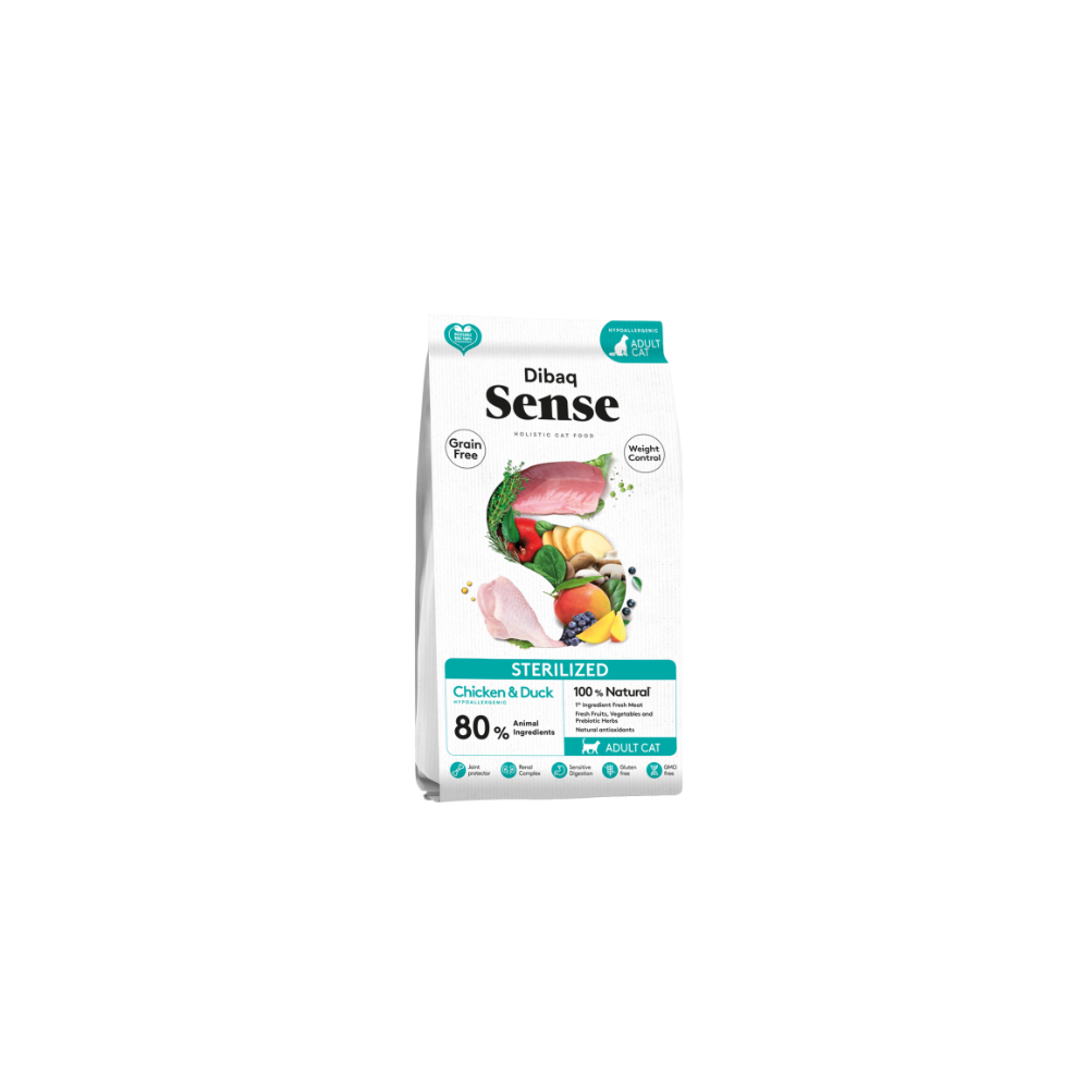 Dibaq Sense Cat Grain Free Sterilized es un alimento sin cereales para gatos esterilizados o con tendencia al sobrepeso. Receta Grain Free con carnes frescas de pollo y pato, frutas y verduras frescas ( champiñones, arándanos, mango y manzana), extracto de malta, yuca, protectores articulares, complejo renal, complejo dental, L-Carnitina y taurina.