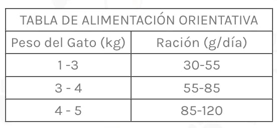 Colocar el alimento en el comedero. Las cantidades indicadas en la tabla de alimentación varían en función del peso, de la actividad física y de la individualidad de cada animal. Cualquier cambio de alimentación debe ser paulatino, a lo largo de 4 o 5 días, para evitar la aparición de desórdenes intestinales. El gato siempre debe tener a su disposición agua limpia y fresca en abundancia. Mantener el envase cerrado en un lugar fresco, oscuro y seco.