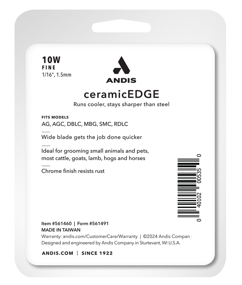 El tiempo es dinero y en ningún otro lugar es más cierto que en el salón de belleza para mascotas. Deje que la nueva línea de cuchillas anchas ceramicEDGE de Andis lo ayude a mejorar su rutina de aseo. Diseñadas para que el aseo profesional sea más rápido y eficiente, las cuchillas anchas ceramicEDGE de Andis son un 36 % más anchas que las cuchillas estándar y cuentan con una cuchilla de corte ceramicEDGE única en su tipo de 31 dientes (un 16 % más que los principales competidores) que proporciona un acabado suave y limpio. Además, las cuchillas de cerámica funcionan a menor temperatura y se mantienen afiladas durante más tiempo. La cuchilla inferior está fabricada con acero al carbono de alta calidad que resiste la corrosión para brindar durabilidad y una larga vida útil. Perfectas para el aseo de perros grandes, equinos y ganado, estas cuchillas son compatibles con todas las cortadoras de cuchillas desmontables profesionales de Andis.