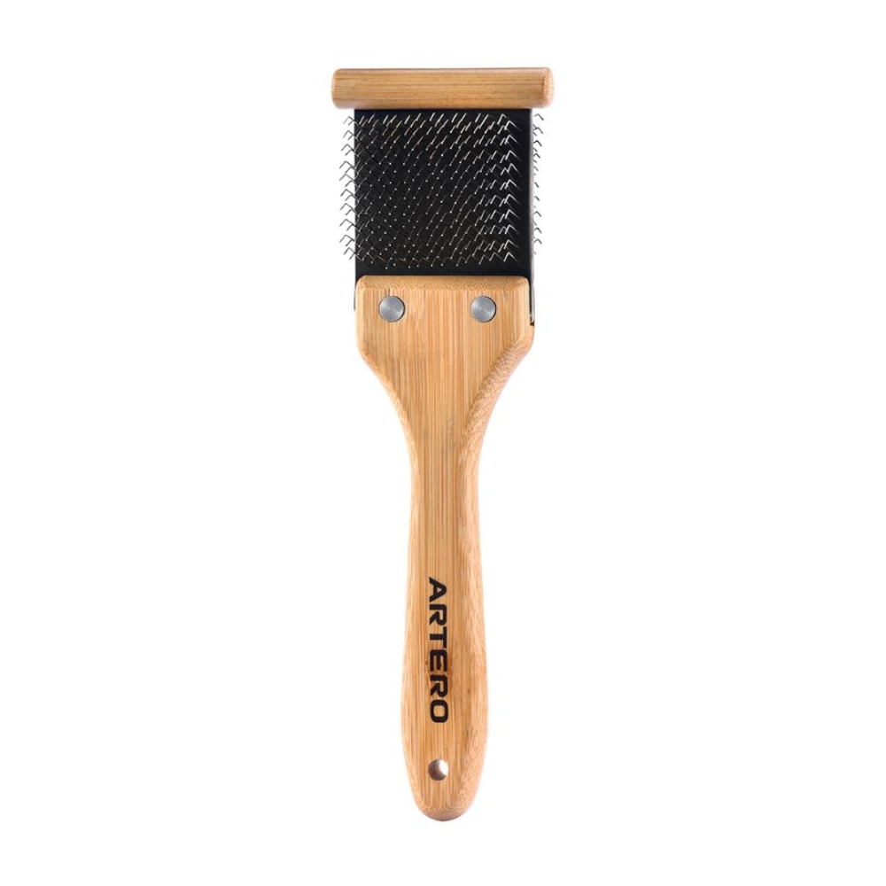Lado gris con púas más delgadas y con un posicionamiento aleatorio ideal para estirar el pelo y abrir el manto, cara negra con púa más gruesa en forma de hilera para desenredar.