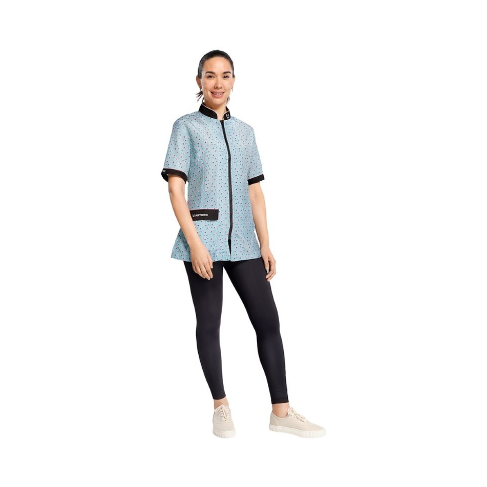 El vestuario laboral femenino de manga corta está diseñado por Artero para peluqueras canina y profesionales de clínicas veterinarias.