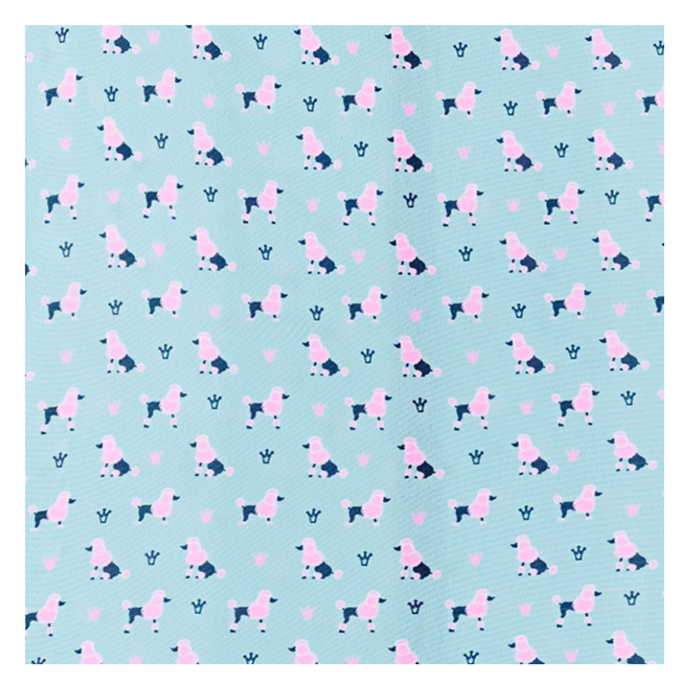 -Tela color turquesa y estampada con caniches gigantes de color rosa y negro.