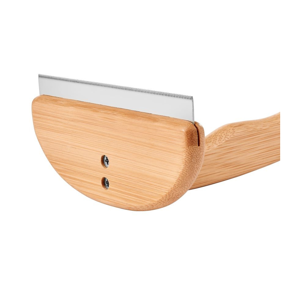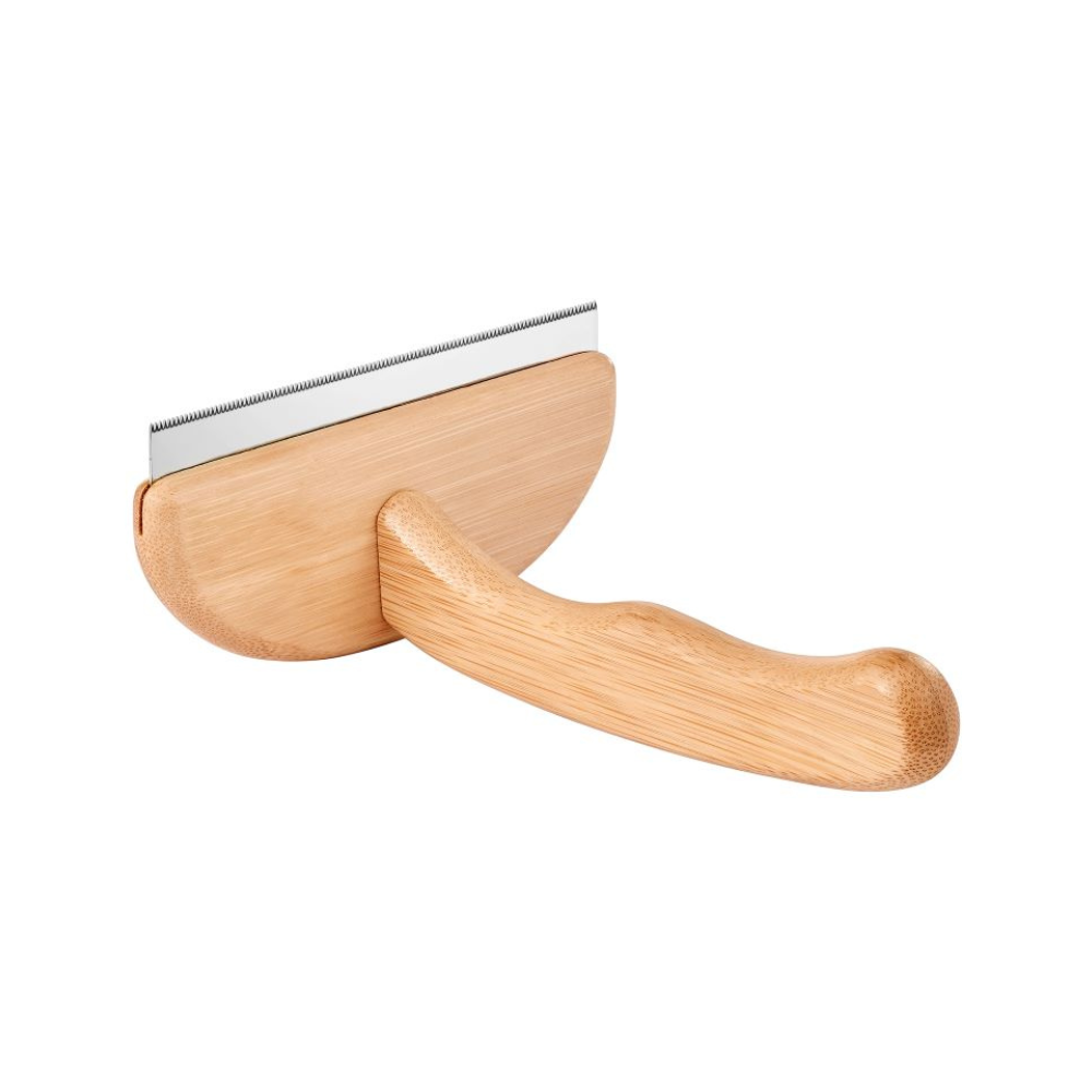 Está hecho con bambú y hoja microdentada para eliminar el pelo y subpelo en perros de pelo corto: