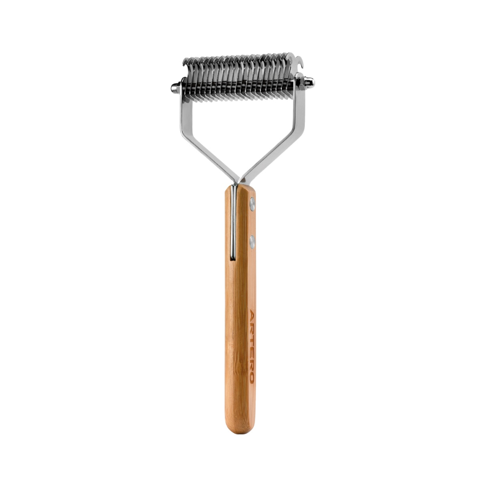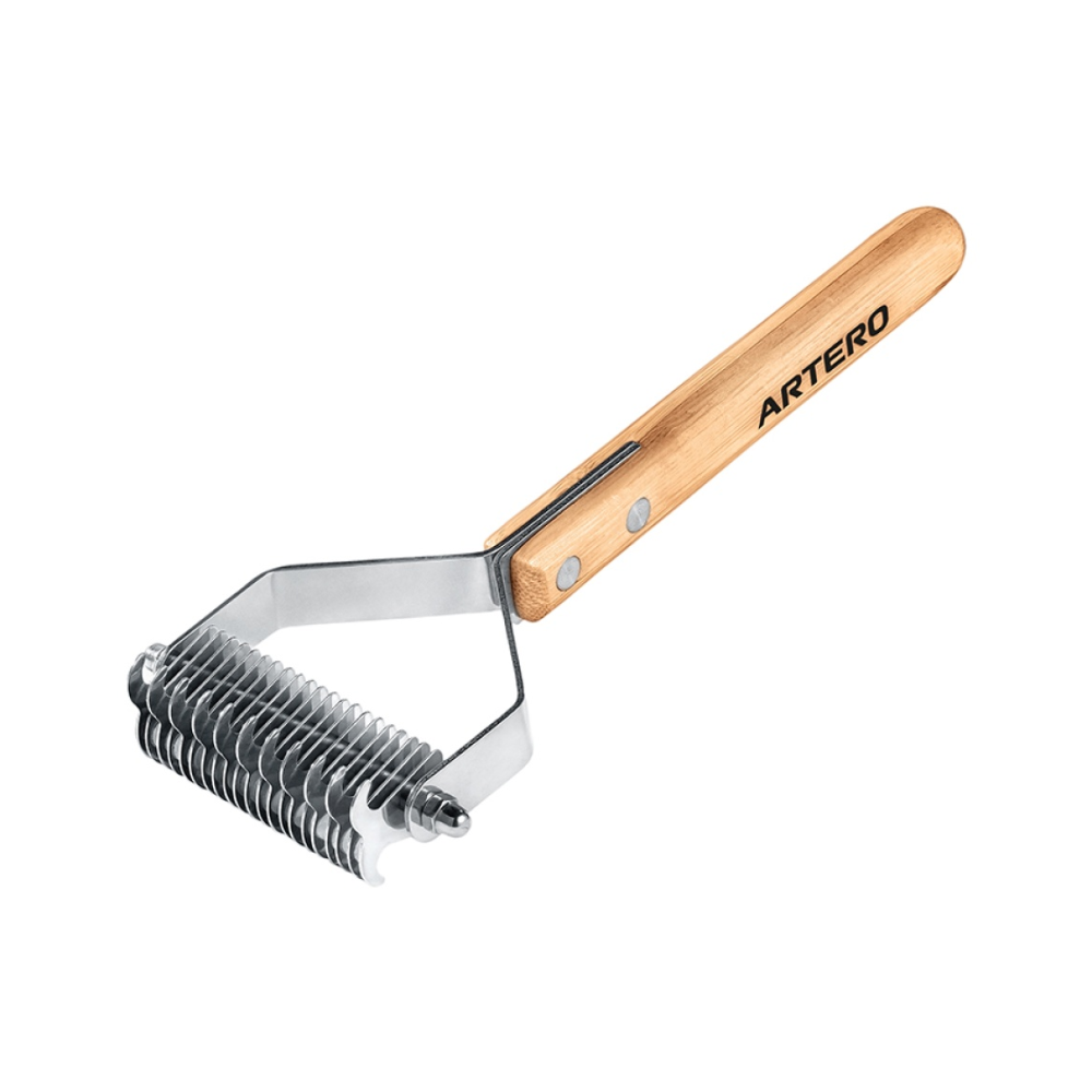 El Artero Supercoat M Nature Collection tiene una cara con 7 hojas para permitir entrar en mantos muy densos, grandes enredos, acumulaciones de muda y una segunda cara con 13 hojas para mantos medios, pequeños enredos y nudos y acabados.