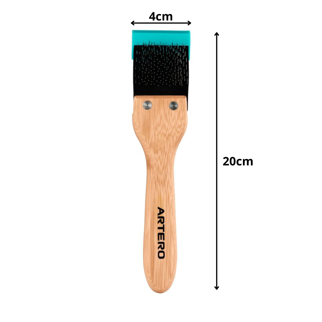 - Mango engrosado y ergonómico que facilita la sujeción de la carda. El profesional podrá pasar la carda en ambos sentidos sin problema alguno y con la intensidad requerida para separar los pelos.