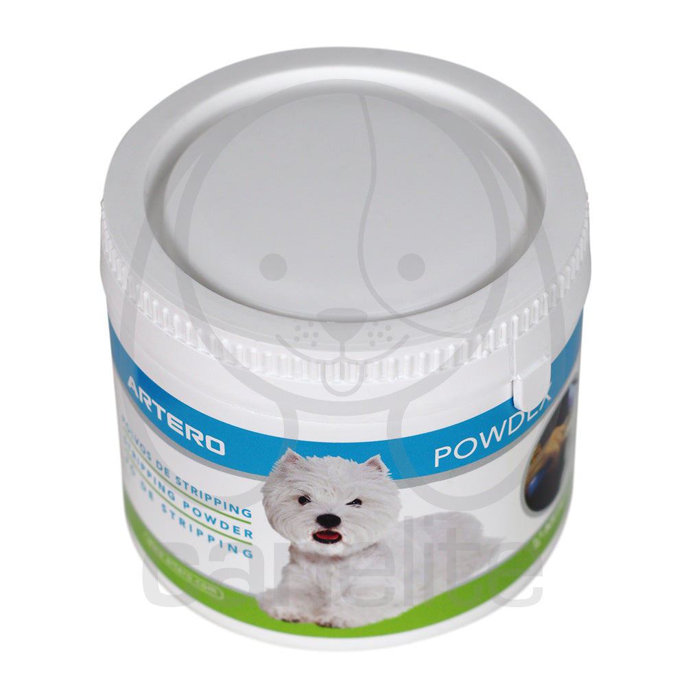 Polvos Stripping a base de carbonato cálcico. Facilitan el ejercicio del stripping debido a su efecto secante consigue que no se resbale el pelo entre los dedos, dedos-cuchilla, dedos-piedra, dedos-stick. También válido para blanquear.