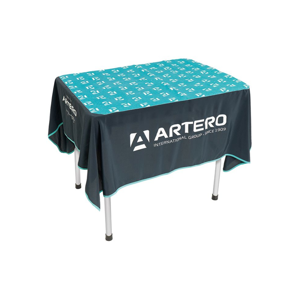 Este Mantel en color Antracita y turquesa con logo Artero consigue resaltar las virtudes de la peluquería del perro, un marco ideal para mostrar los trabajos.