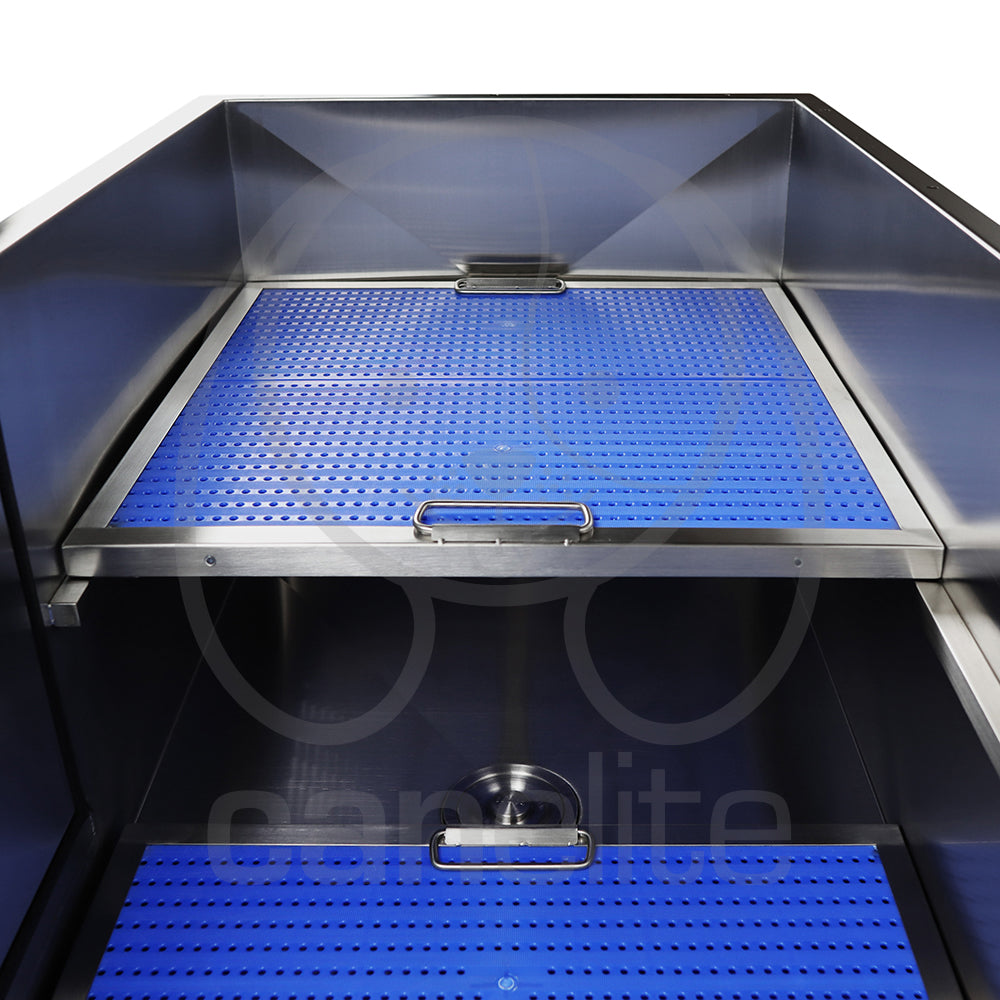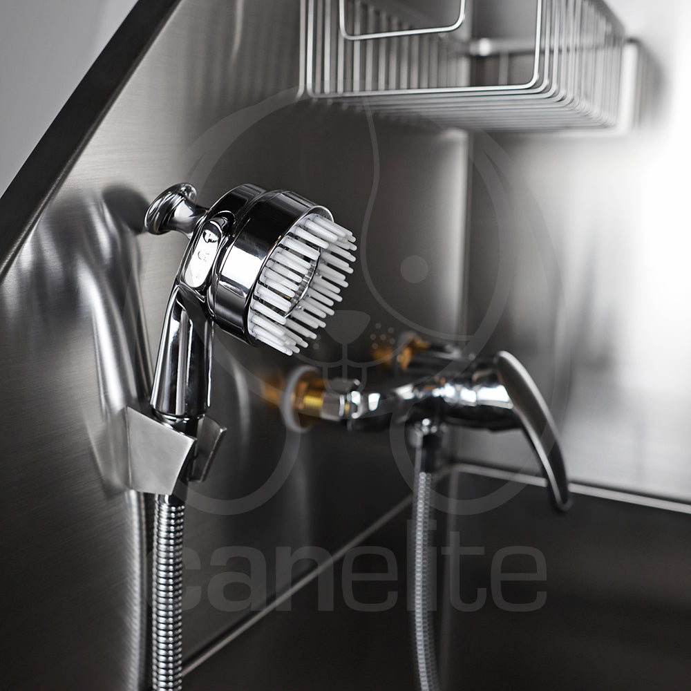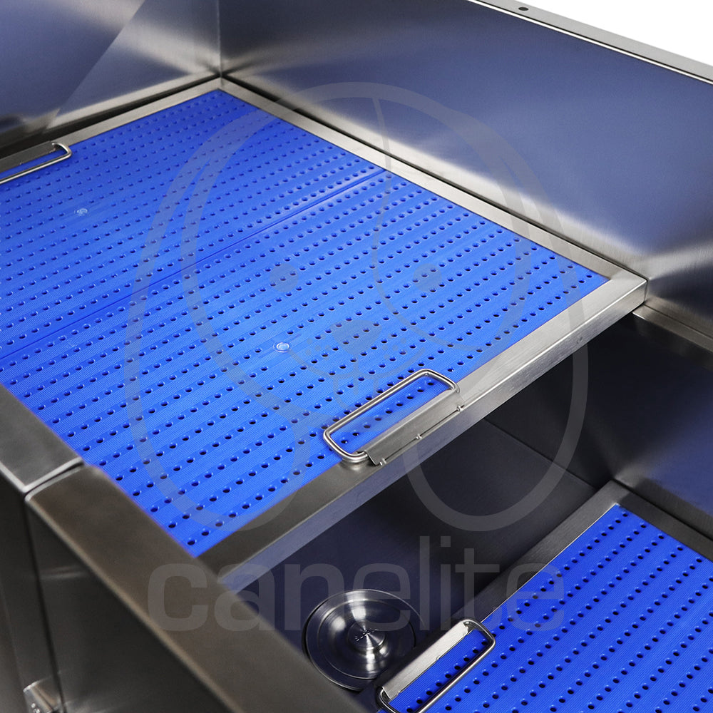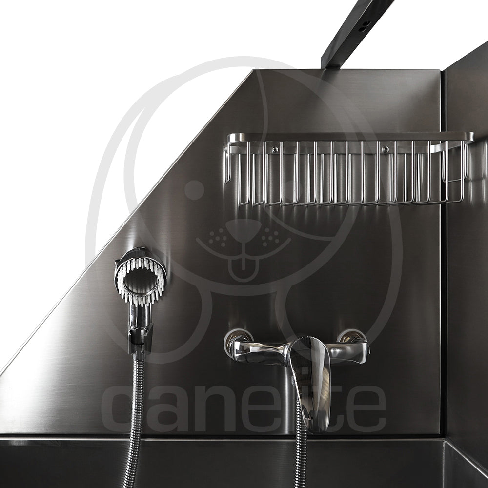 Con una plataforma para cachorros para ayudar a evitar que sus animales se sumerjan y aliviar la tensión que puede sufrir su espalda cuando trabaja agachado para animales más pequeños. Su bañera también vendrá equipada con orificios pretaladrados en los protectores contra salpicaduras izquierdo y derecho para instalar un grifo de agua fría/caliente.