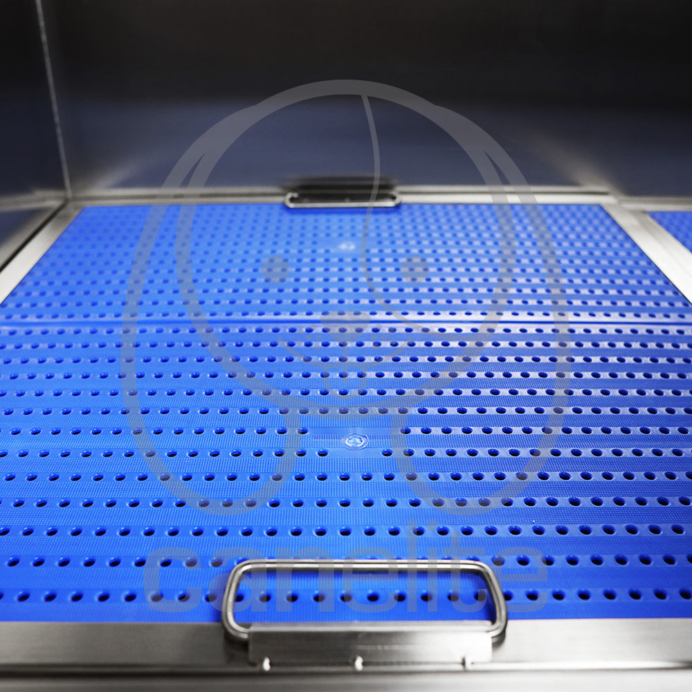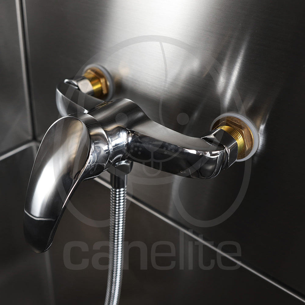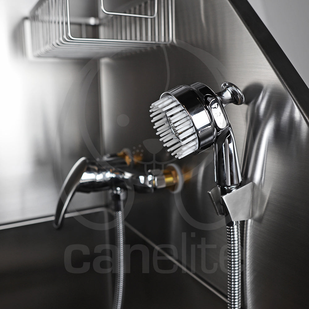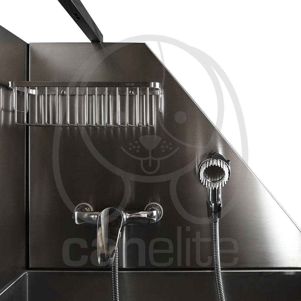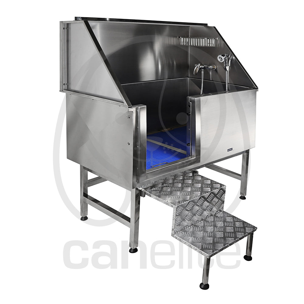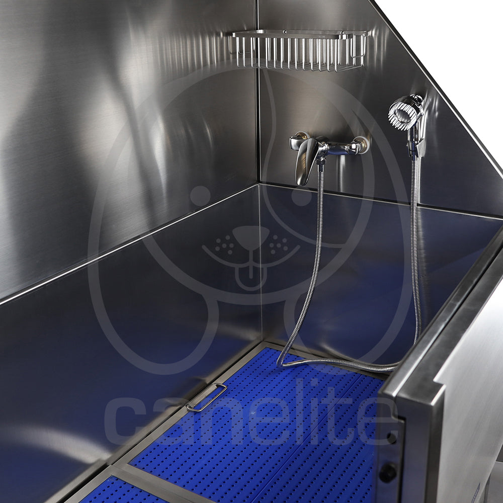 Con una plataforma que ayuda durante el secado de los animales. La bañera viene equipada con orificios preperforados en los protectores contra salpicaduras izquierdo y derecho para instalar un grifo caliente/frío.