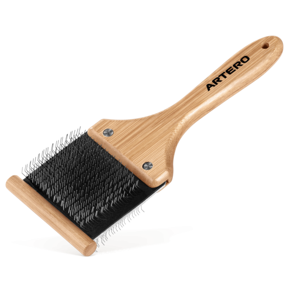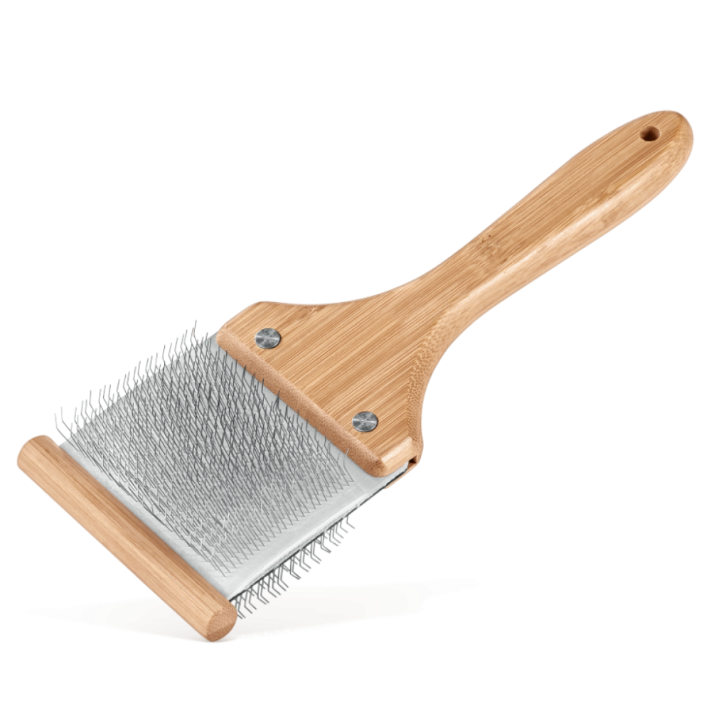 Lado gris con púas más delgadas y con un posicionamiento aleatorio ideal para estirar el pelo y abrir el manto, cara negra con púa más gruesa en forma de hilera para desenredar.