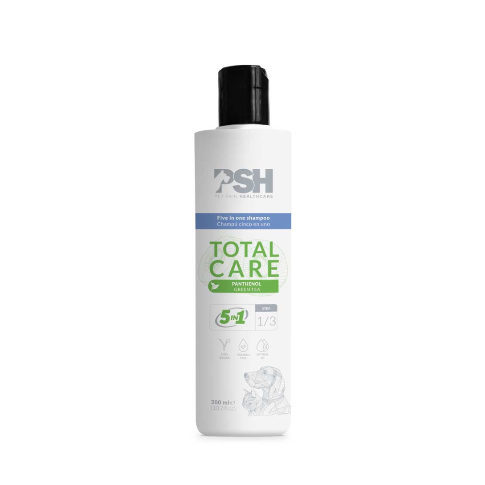 Champú Total Care 5 en 1 PSH 300 ml Champú para todo tipo de mantos: Limpia, Nutre, Acondiciona, Revitaliza y aporta Volumen. Modo de empleo: Aplicar con el manto previamente mojado, realizar un lavado masajeando enérgicamente para eliminar todo tipo de impurezas en el manto y aclarar.