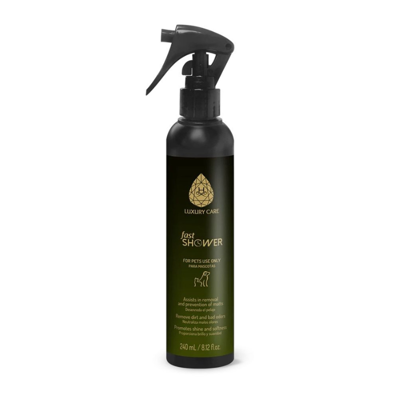 Fast shower en spray es un modo fácil y ecológico de higienizar su mascota sin la utilización de agua. Contiene un activo neutralizador que elimina el mal olor y otros activos especiales que facilitan el cepillado y previenen la formación de nudos. Proporciona brillo y suavidad para el pelaje.