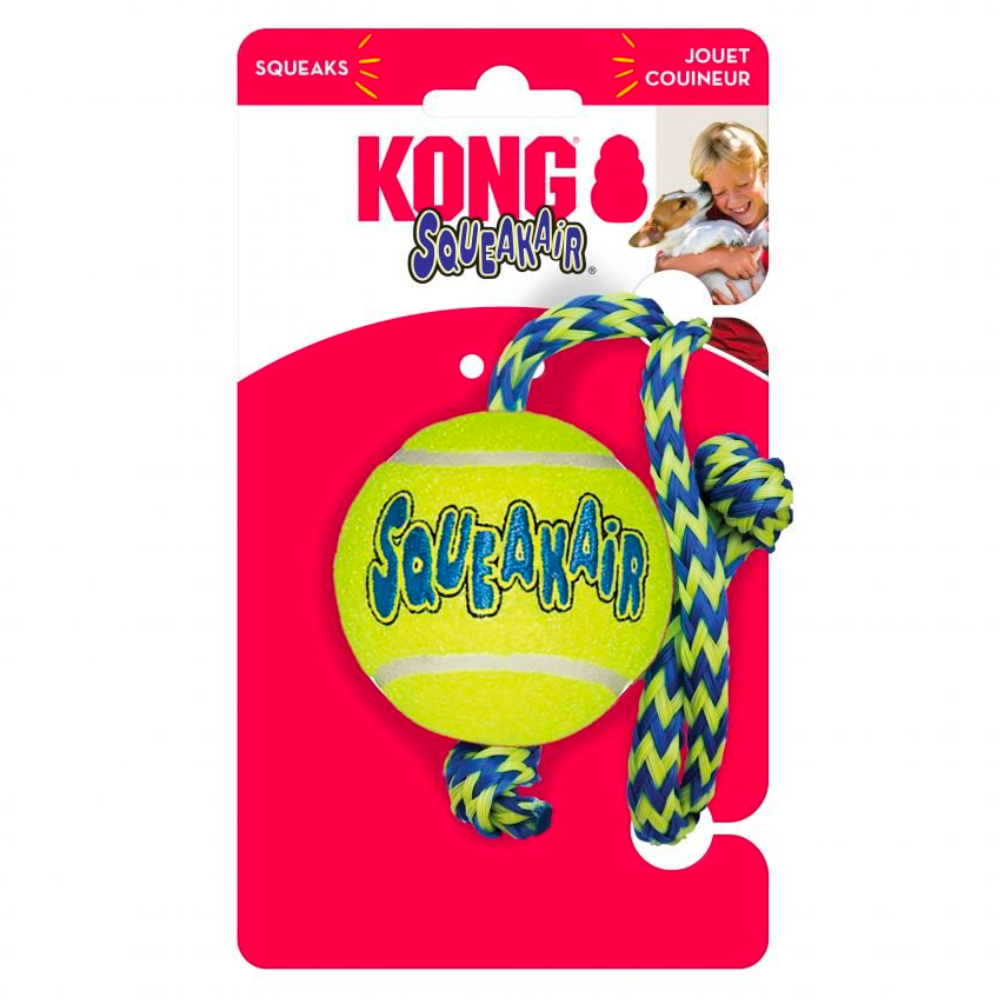 La KONG AirDog Squeakair Ball with Rope combina dos juguetes clásicos para perros: la pelota de tenis y el chirriador. Dotado de una cuerda resistente, es el juguete de buscar y recoger perfecto. Nuestro AirDog Squeakair Ball, resistente y de alta calidad, no desgastará los dientes del perro. Está hecho con un fieltro no abrasivo especial, no con el material abrasivo de las pelotas de tenis normales.