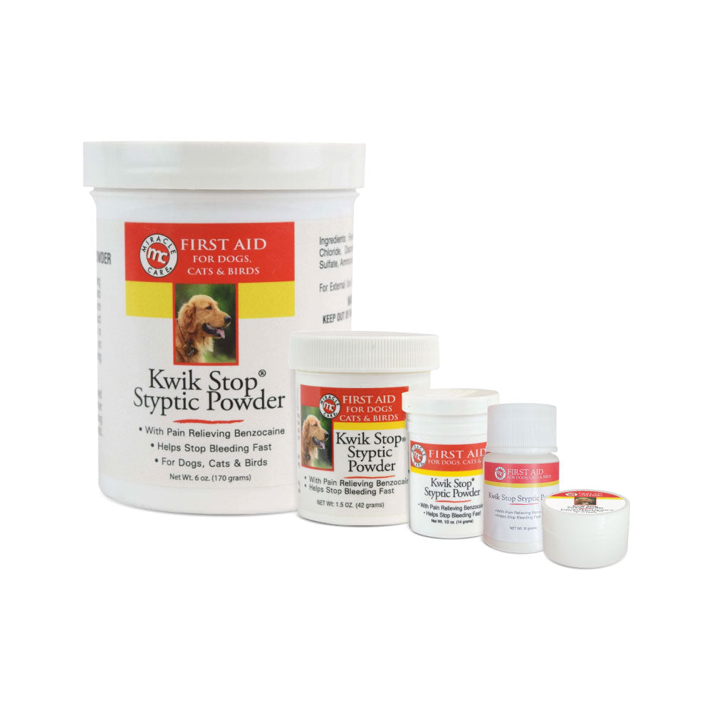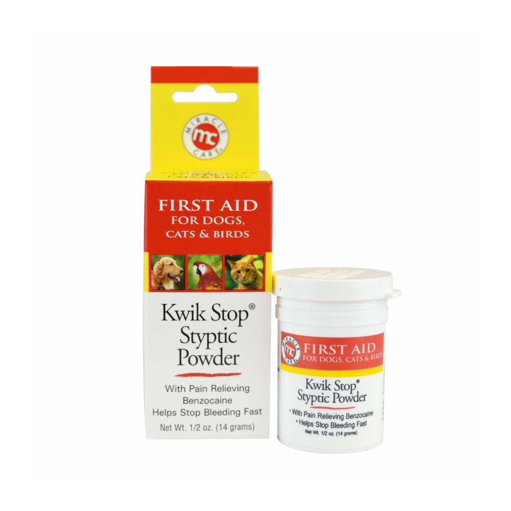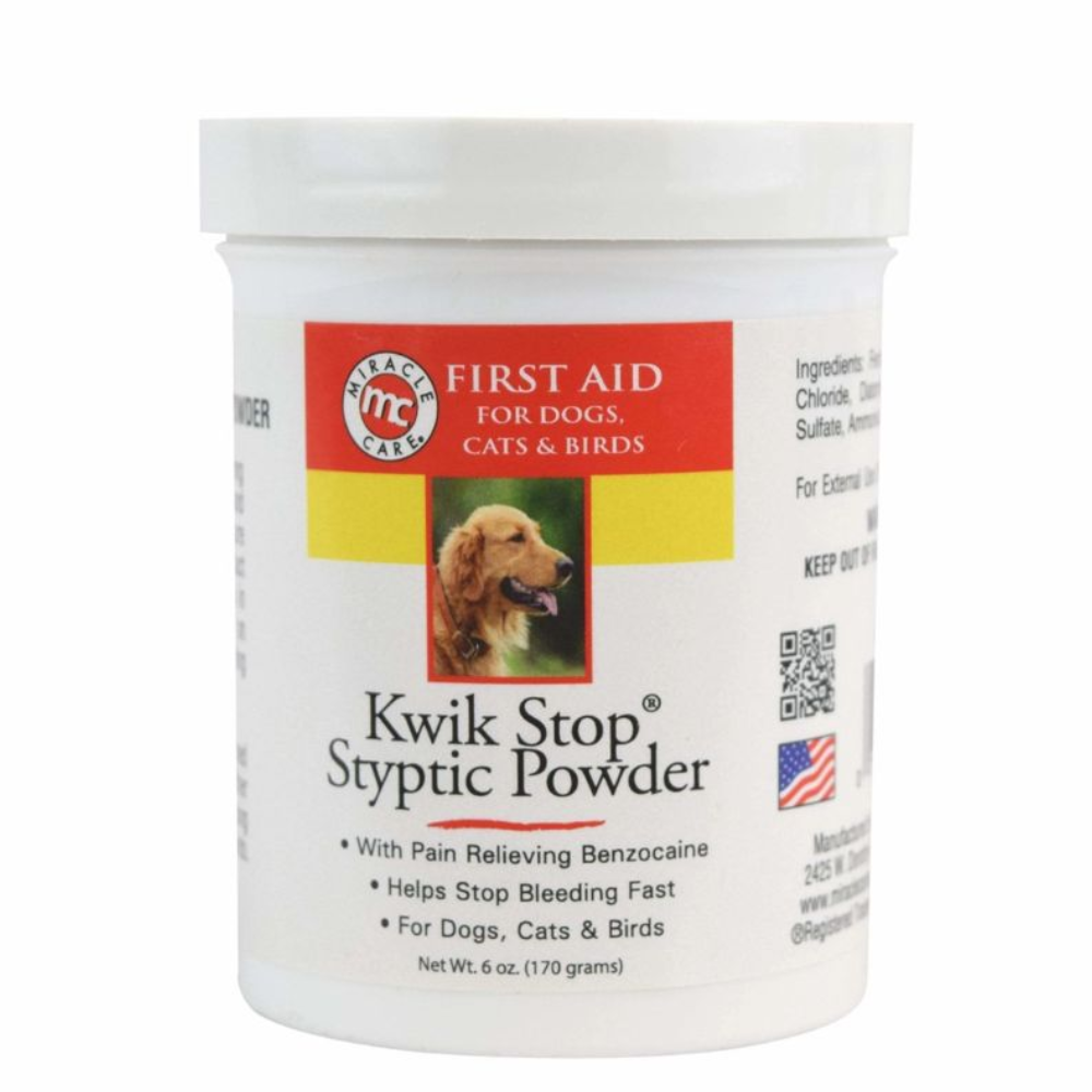 Con benzocaína se puede utilizar para uso externo en perros, gatos y pájaros. El polvo Styptic de Kwik Stop se puede utilizar para detener el sangrado causado por cortar clavos, acoplar colas, recortar picos y cortes menores. Polvo estíptico más utilizado en el mundo.