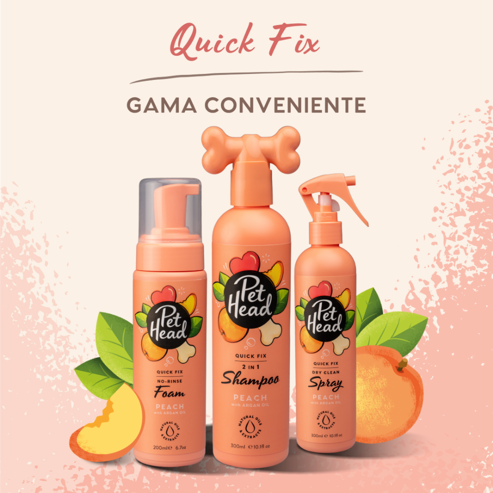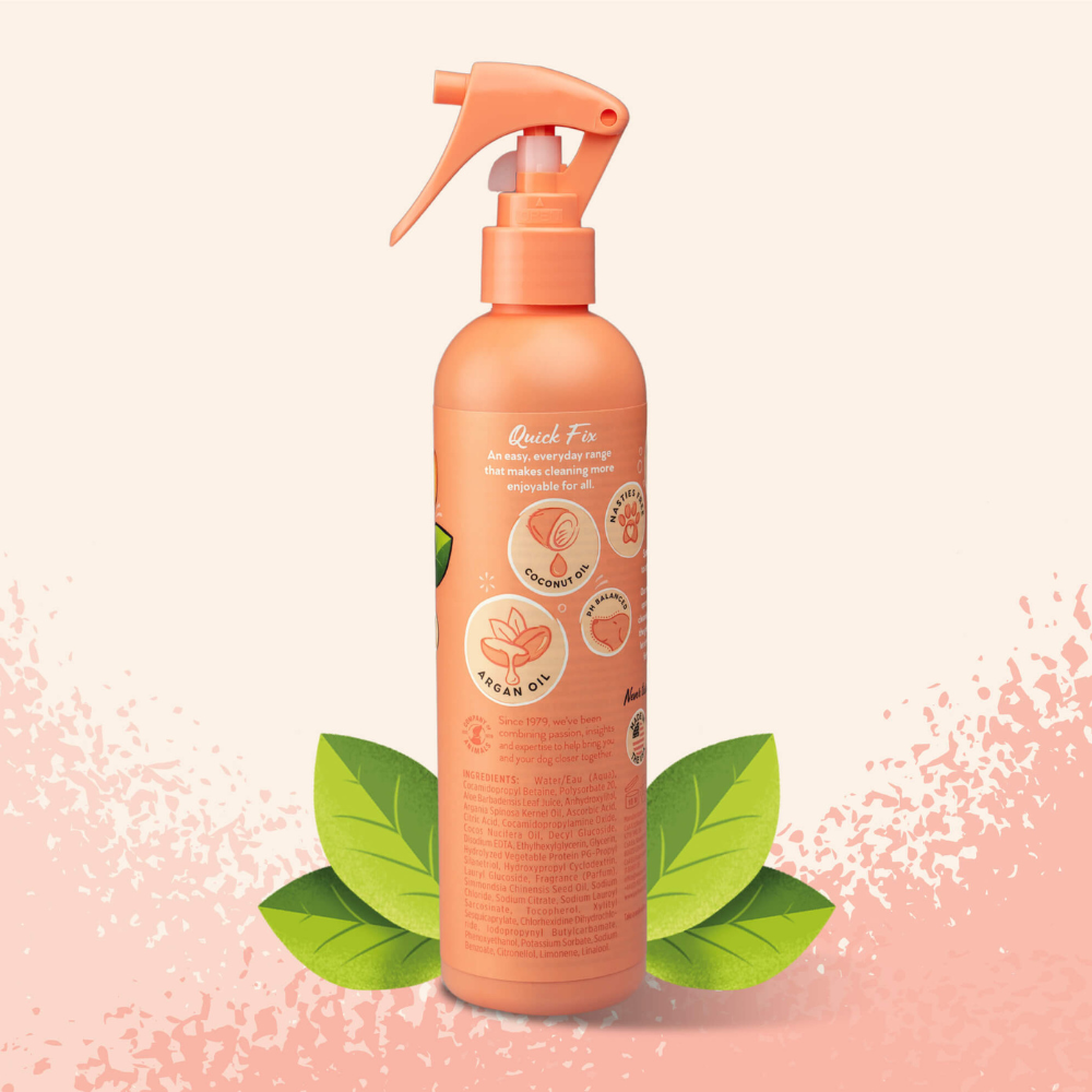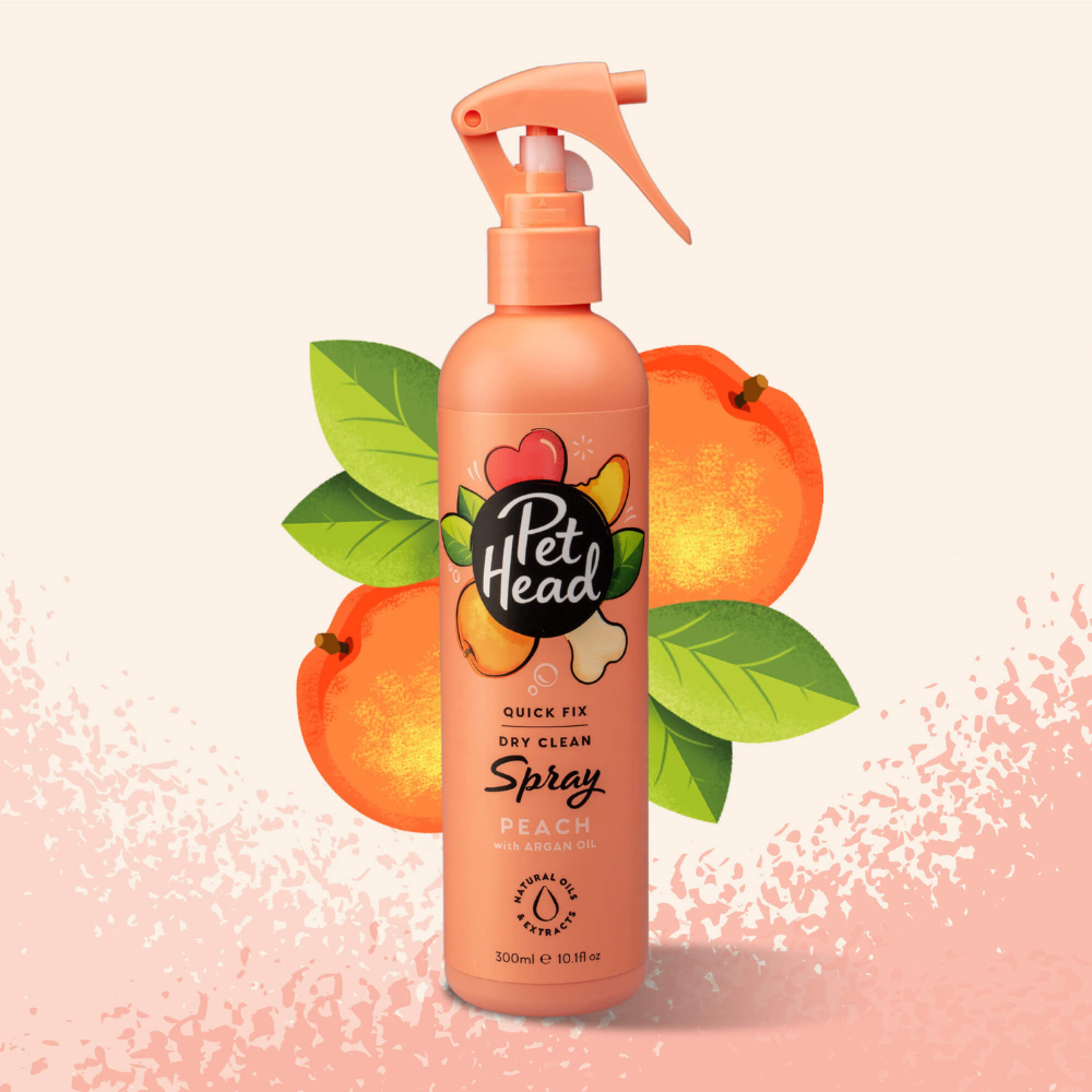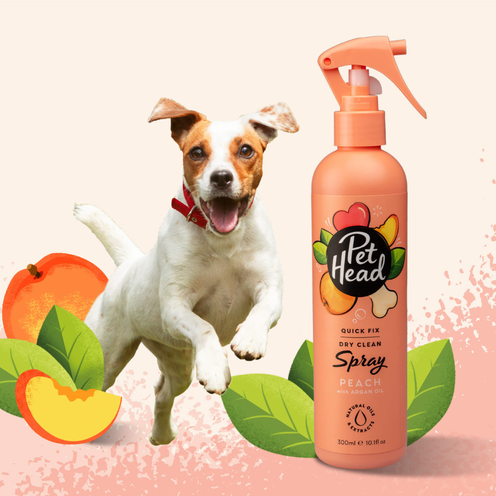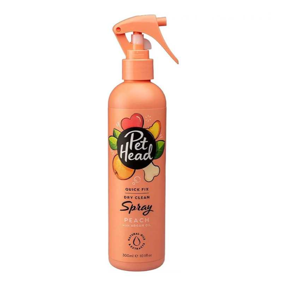 El spray desodorante para perros Pet Head Quick Fix es la forma perfecta de limpiar a su mascota cuando está fuera de casa. Tiene una fragancia de durazno. Contiene aceite de argán, coco y jojoba, que actúan conjuntamente para nutrir y suavizar el pelaje y la piel. No contiene parabenos, tensioactivos ni colorantes. Además, no contiene gluten ni frutos secos.