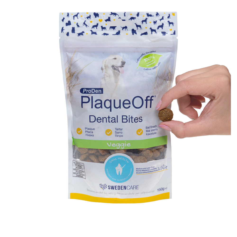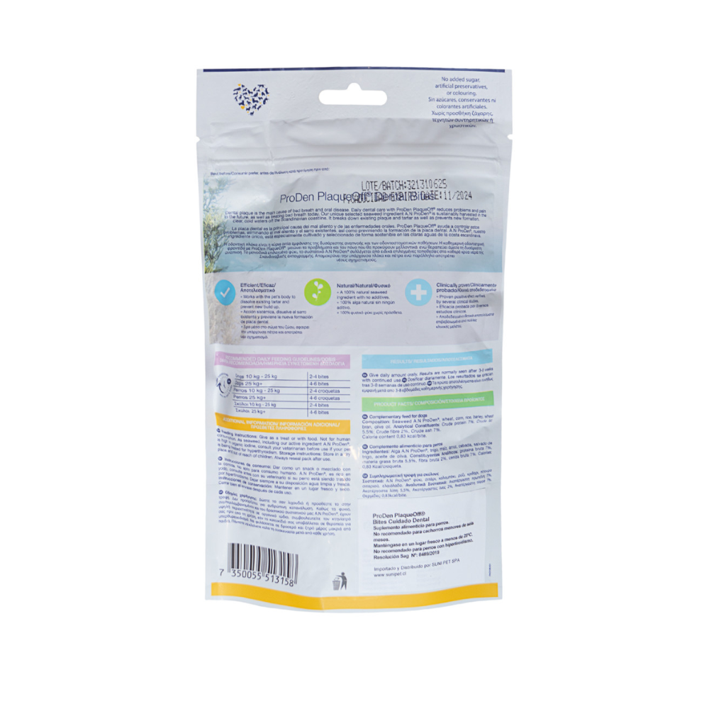 ProDen PlaqueOff® Snack dental tiene como principal ingrediente un alga especialmente seleccionada, que ha demostrado en ensayos clínicos, su efectividad para reducir la acumulación de placa, la formación de sarro y el mal aliento y viene en un formato muy fácil de administrar. ProDen Plaqueoff® es único ya que actúa desde el interior. Sin azucares añadidos, ni aditivos, conservantes ni colorantes artificiales. Es un producto 100% natural.