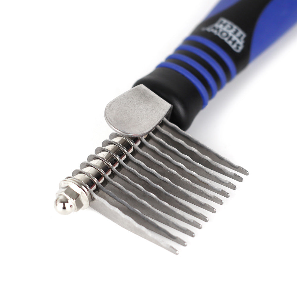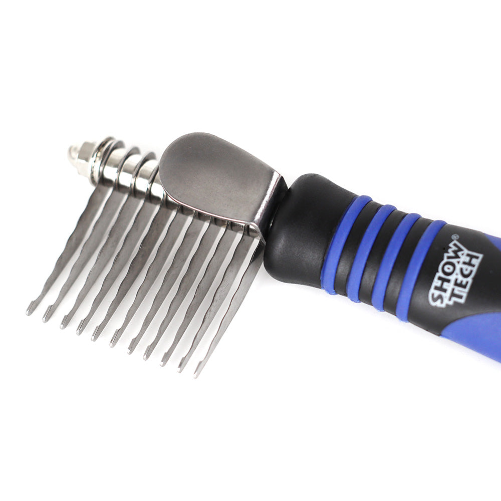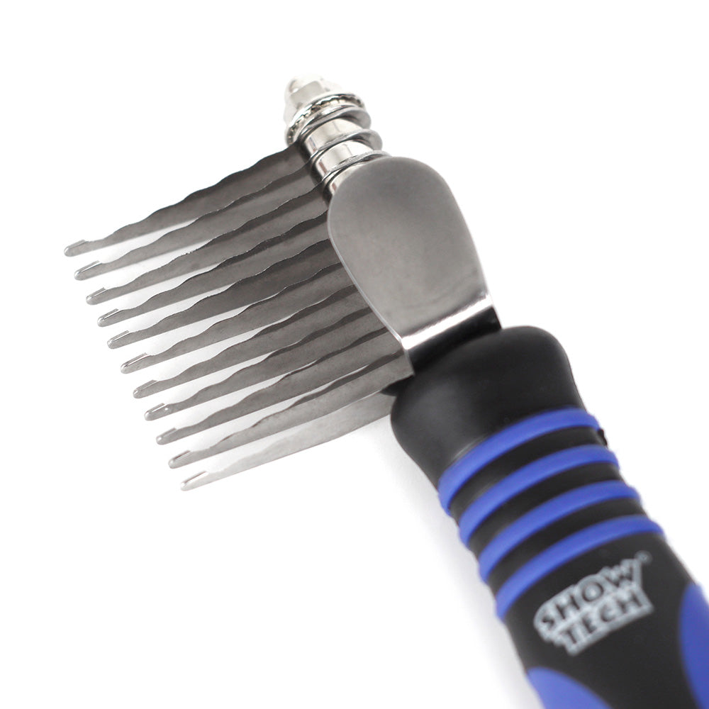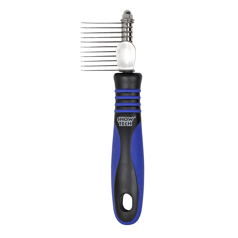 El peine desenredante de Show Tech cuenta con 9 cuchillas dentadas de acero inoxidable con punta redondeada para una máxima seguridad. El diseño especial de la cuchilla proporciona una remoción de tapetes sin esfuerzo. El mango ergonómico cuenta con goma antideslizante para máxima comodidad y agarre. Las cuchillas se pueden invertir fácilmente para uso con la mano izquierda.