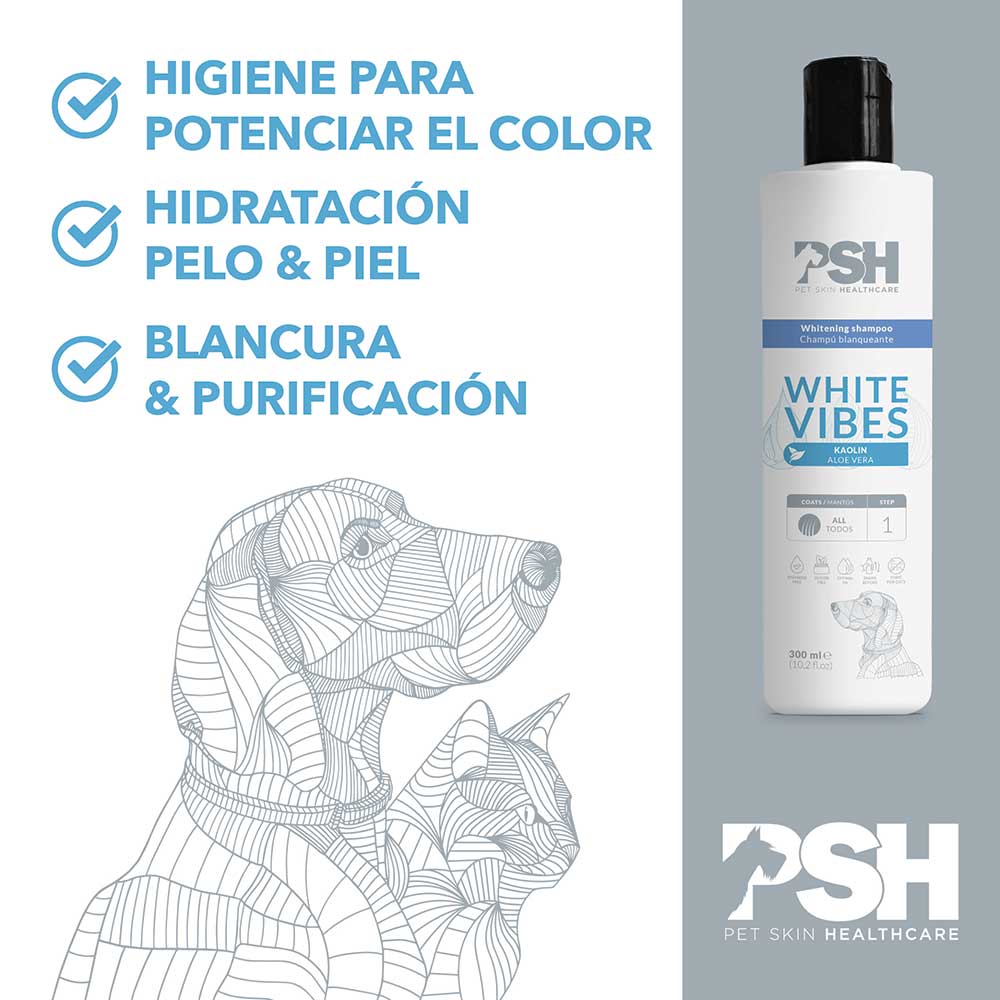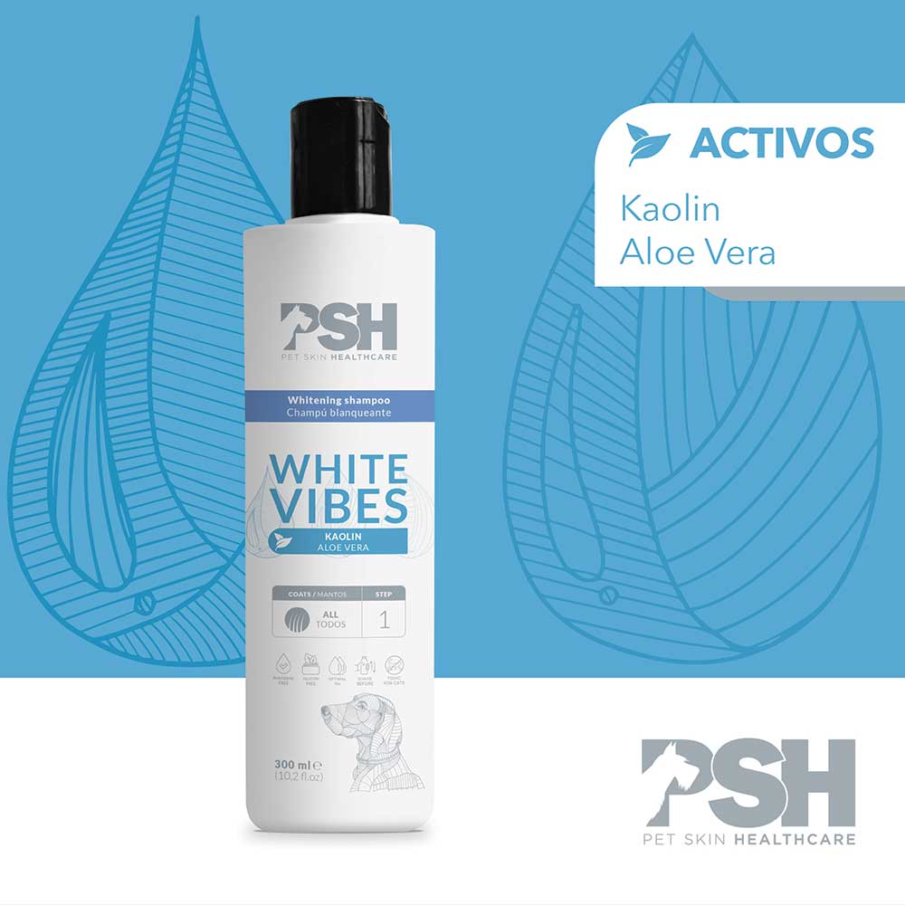 Recomendamos aplicar un primer lavado para retirar todo tipo de impurezas, previamente. Con el manto limpio y mojado, realizar un lavado con Whitening vibes shampoo para conseguir el efecto blanqueante. Para conseguir un resultado óptimo combinar con un acondicionador PSH posteriormente al lavado, aplicar en el sentido del pelo y aclarar con abundante agua. Realizar un enjuague abundante hasta la completa eliminación del producto.
