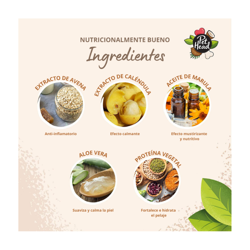 Todos los productos de Pet Head están libres de sustancias nocivas: sin parabenos, tensioactivos ni colorantes. No contienen gluten ni frutos secos para mayor seguridad. Todos los ingredientes están completamente listados en nuestros envases. Pet Head se enorgullece de ser vegano y de estar libre de crueldad.