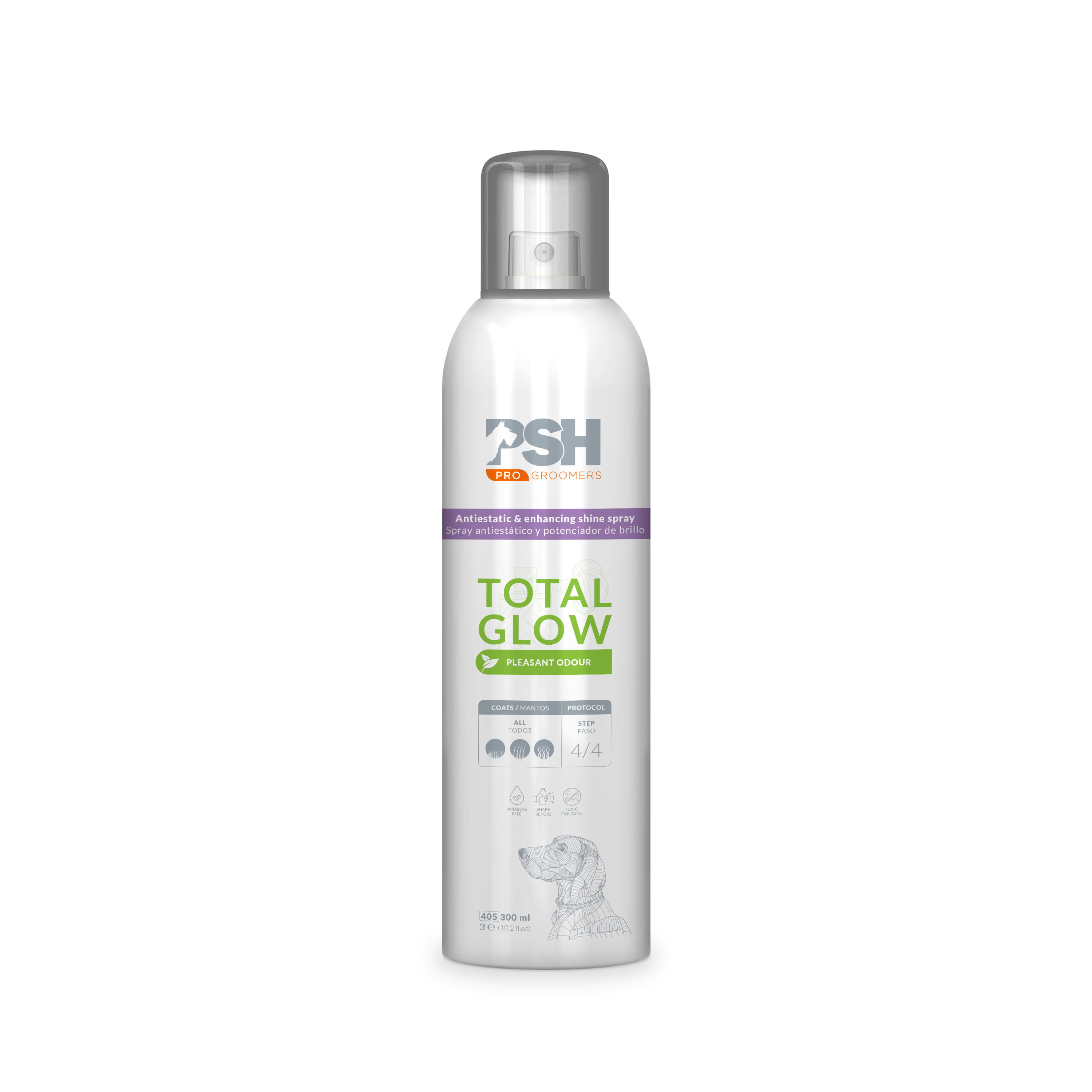 PSH GLOW Acabado Total está especialmente formulado tanto para aportar brillo como para eliminar la electricidad estática del manto del perro, dejando un olor fresco y duradero.